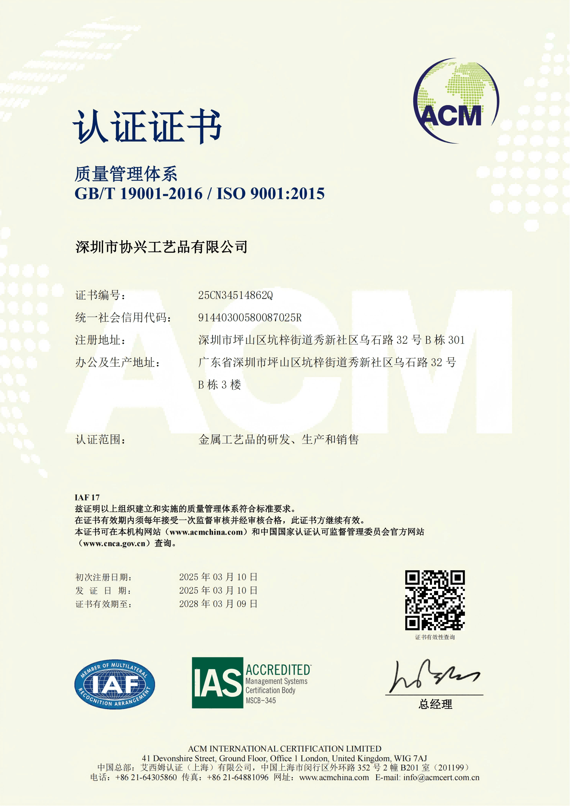 协兴工艺建立了完善的质量管理体系,从原材料采购到成品出厂,每个环节都有严格的质量控制标准。我们通过了ISO9001质量管理体系认证、SEDEX4P社会责任认证、迪士尼验厂等多项国际认证,确保产品质量和生产流程符合国际标准。